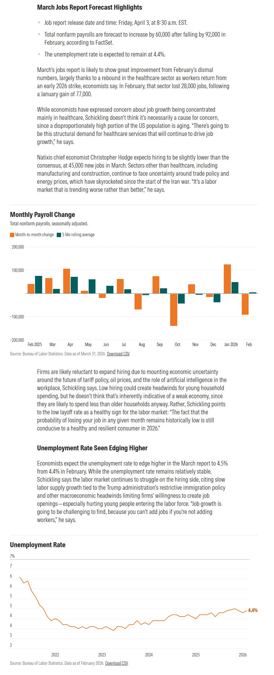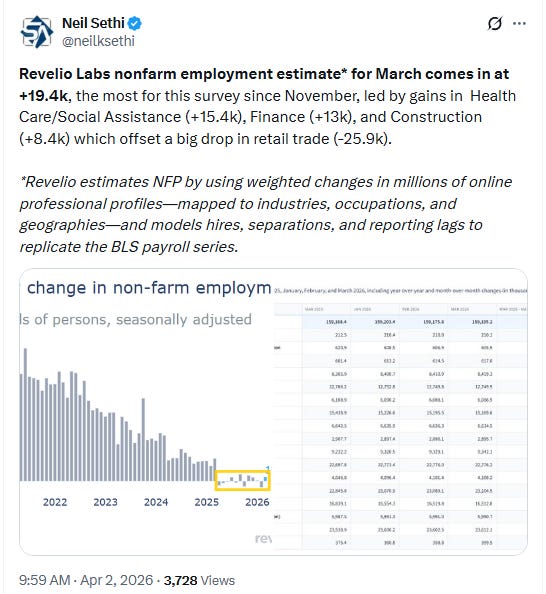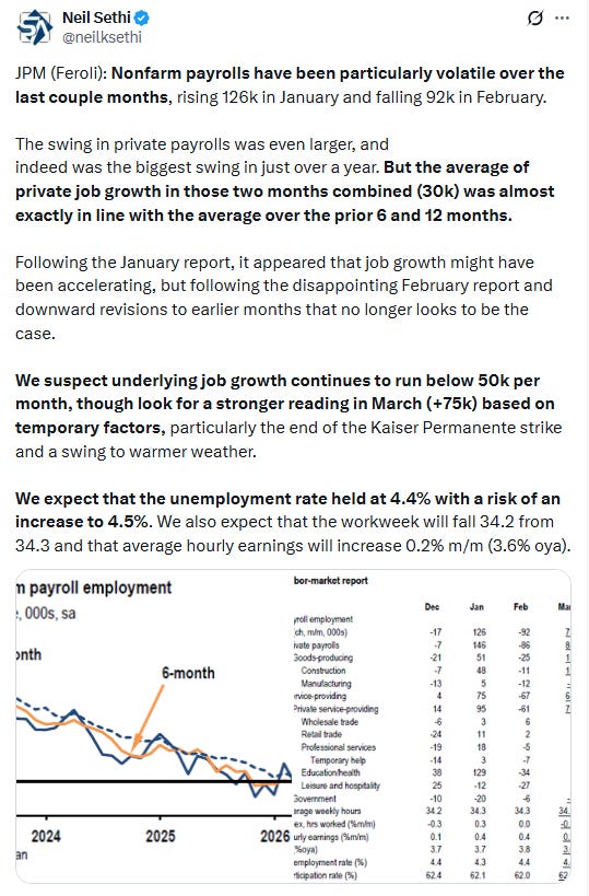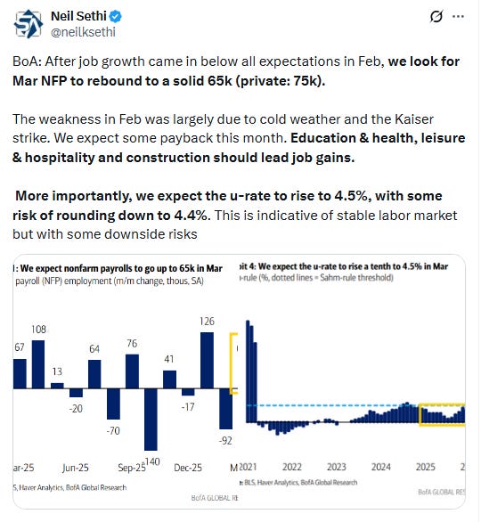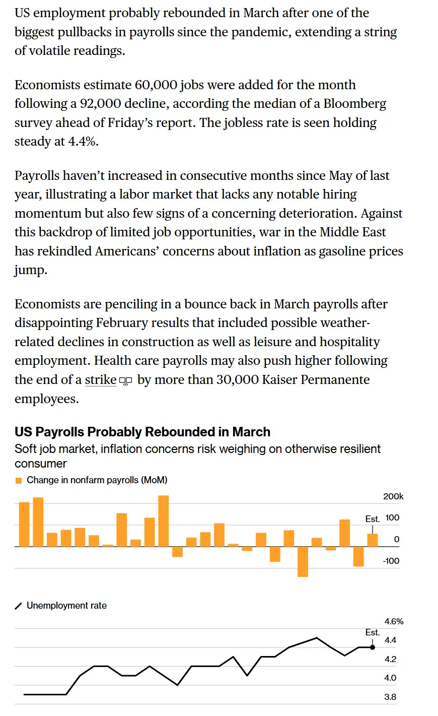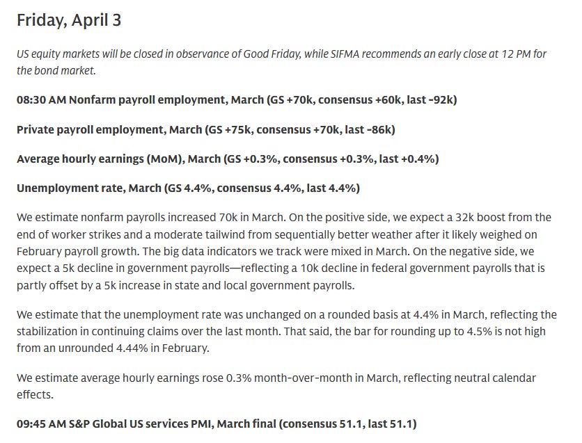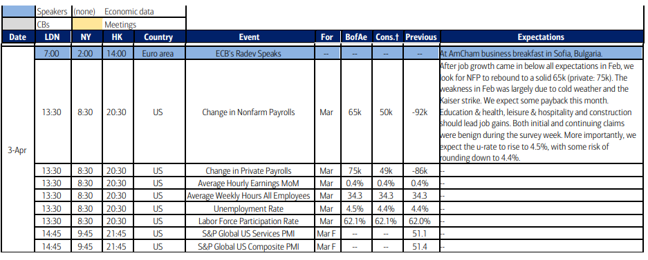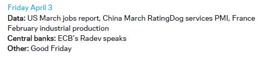 While US (and many ex-US) equity markets will be closed Friday (bond markets will have a half-session) US economic data continues with our most watched report of the month in the Employment Situation survey for March. We’ll also get S&P services PMI (ISM is Monday).