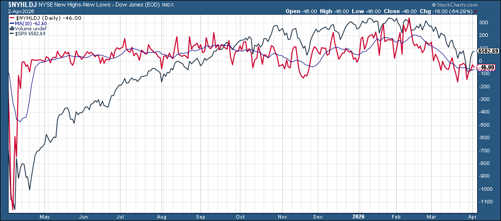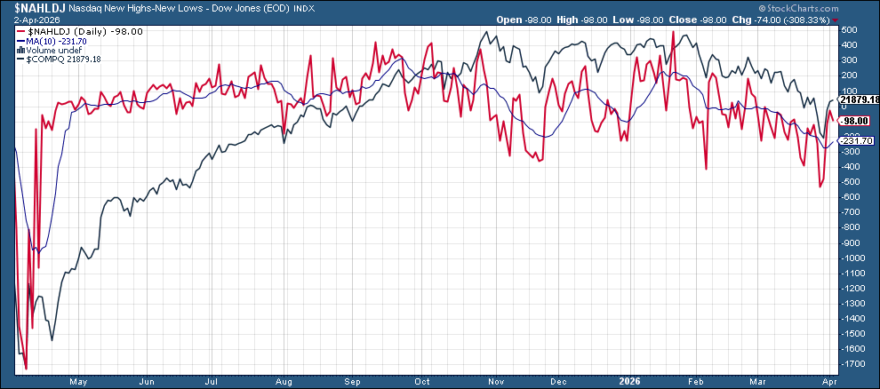 New 52-wk highs minus new 52-wk lows (red lines) though fell back to -46 on the NYSE and to -103 on the Nasdaq (but still up from -528 Friday, the least since April).