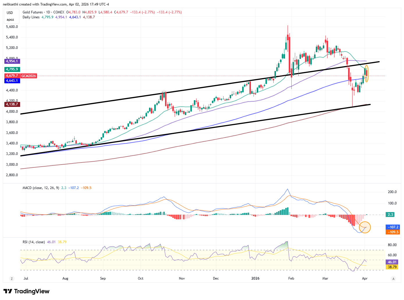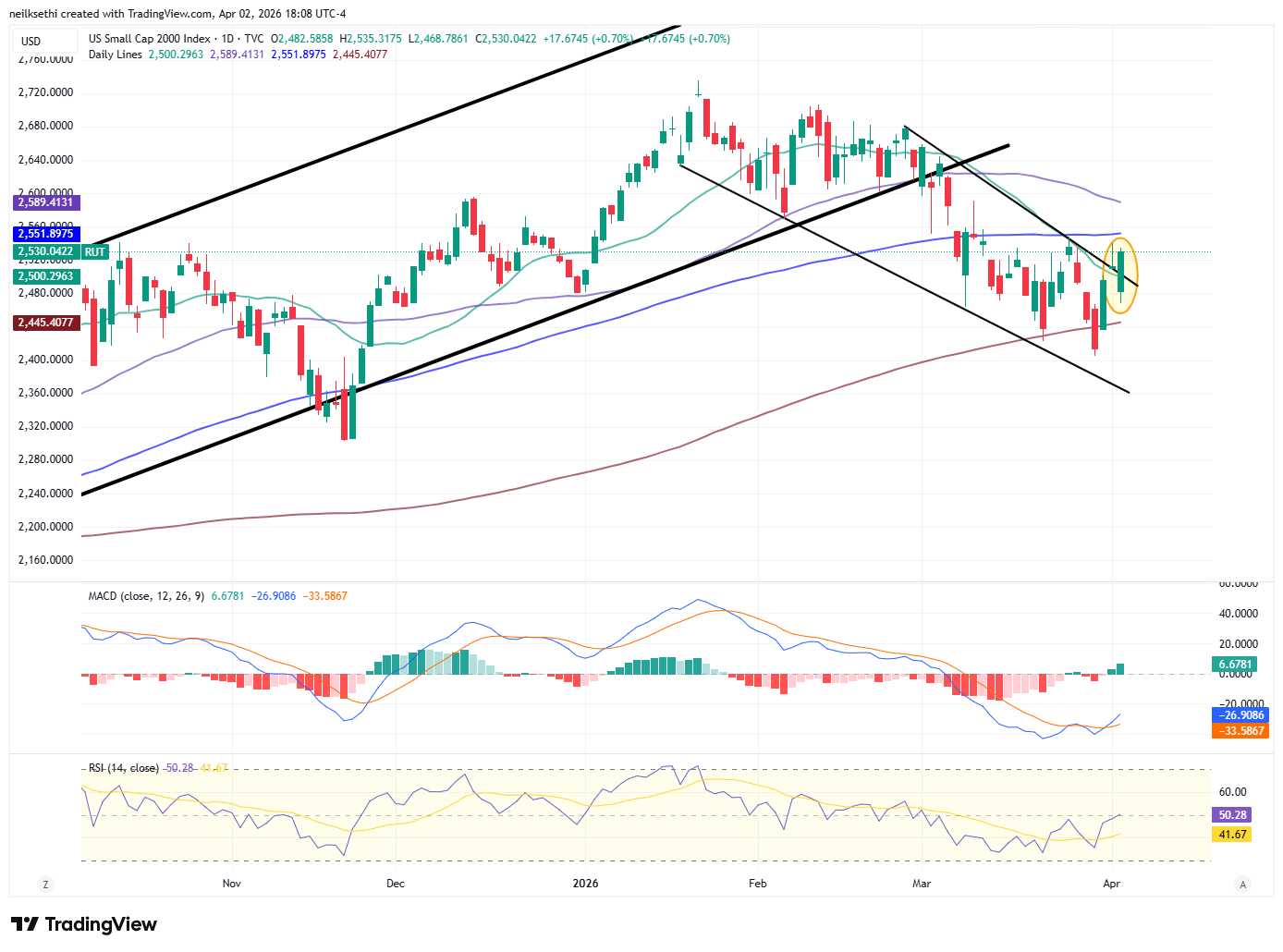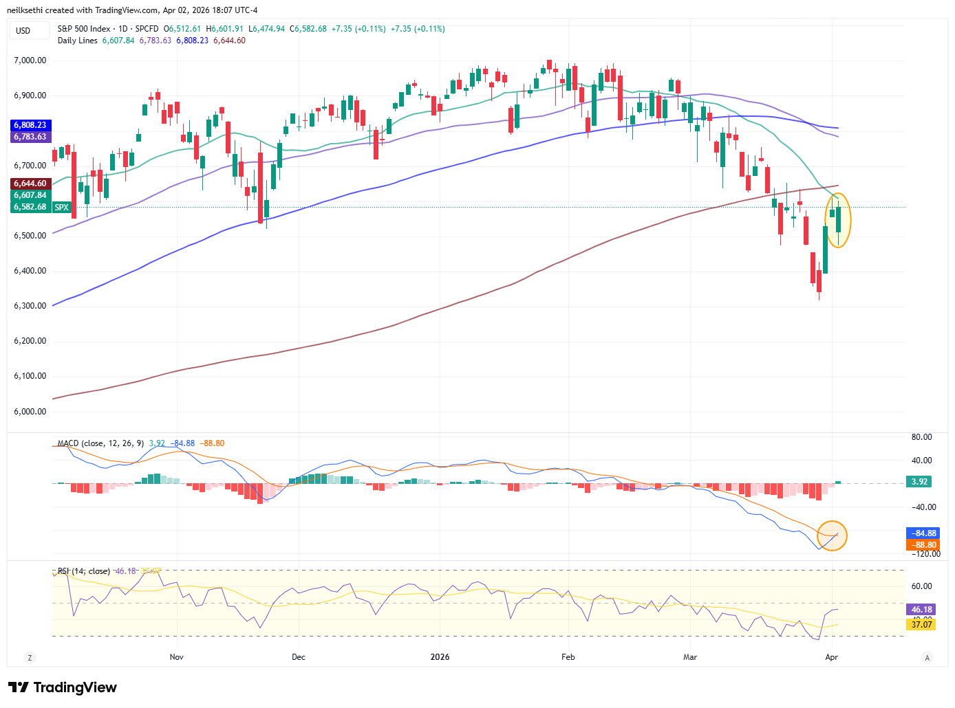 Despite the down session, the daily MACD flipped to a “cover shorts” reading, and I had noted a week ago the RSI moved from under 30 (for the first time since Oct ‘23) to over, which can be evidence of a reversal, which we’d finally seen.