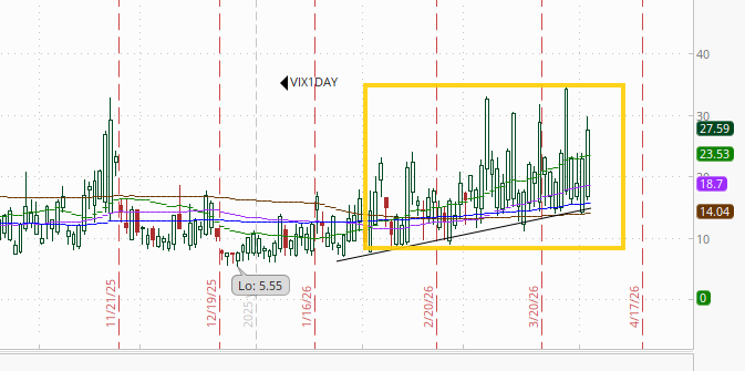 With a 3-day weekend ahead, the 1-day VIX jumped higher to 27.6, but that’s interestingly the least of any pre-weekend read since the start of the Iran conflict (despite having an extra day). That is still consistent with a move of 1.72% in the SPX next session.