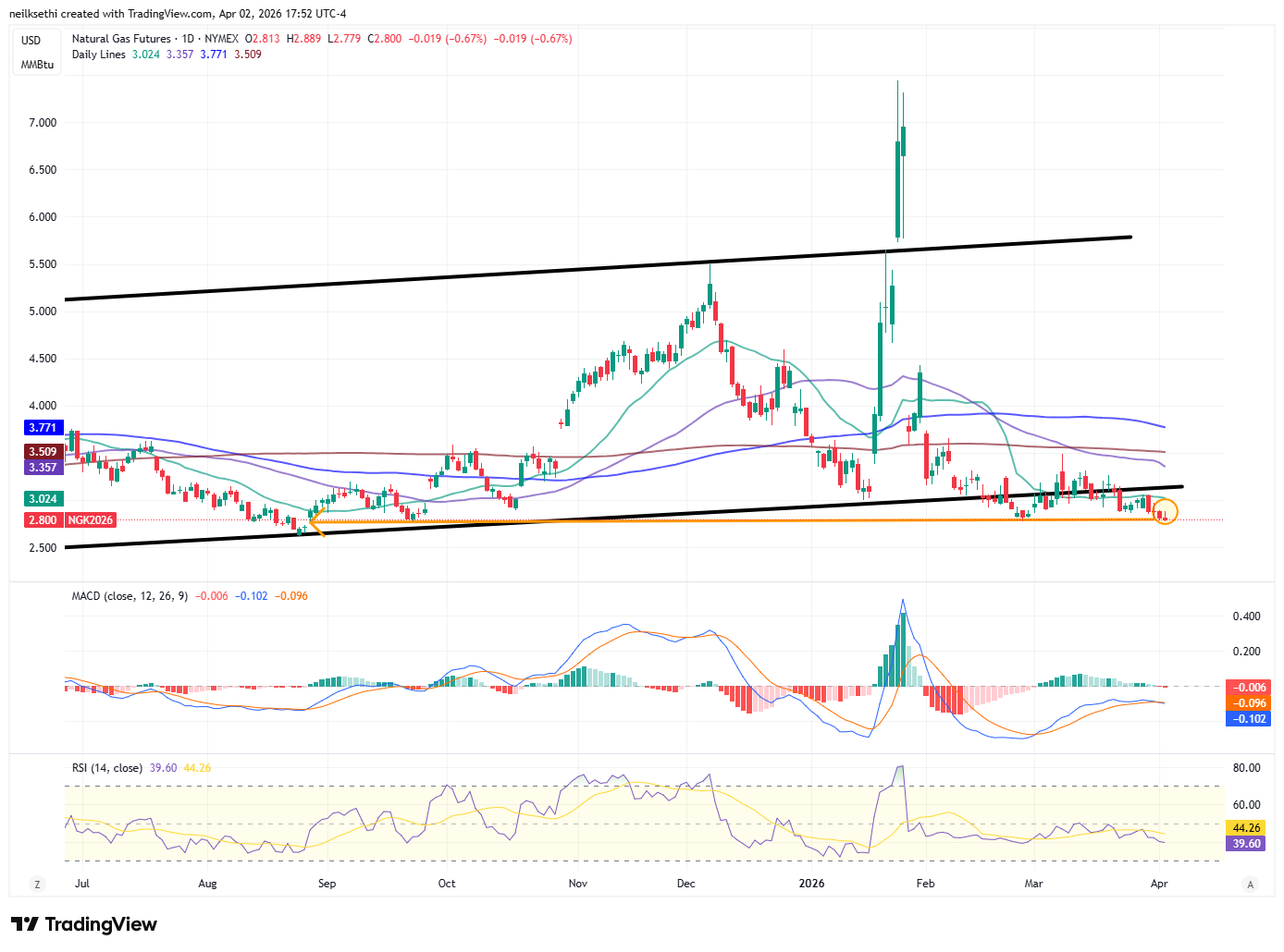 Natural gas futures (/NG) edged to the least since August. The daily MACD as mentioned Wed has crossed to “go short” positioning, and the RSI is now under 40.