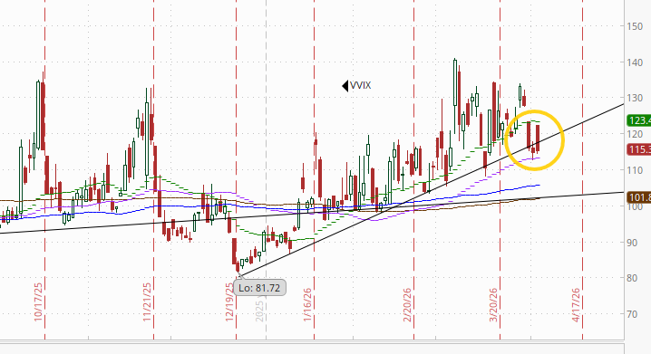 The VVIX (VIX of the VIX) little changed at 115.3, remaining under its uptrend line from the December lows. As I mentioned Wed, '“We’ll see if it falls further which will be a good indicator of the VIX likely following.”