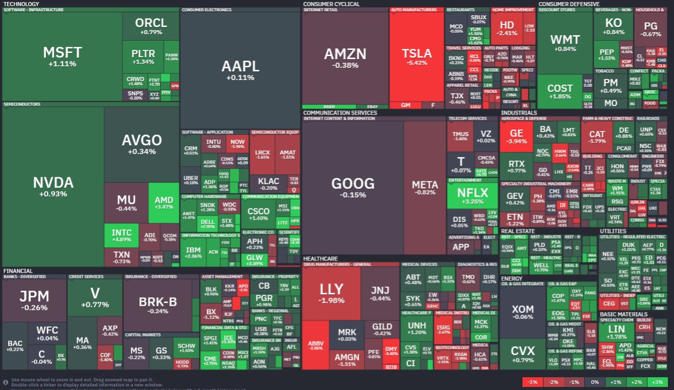 Stock-by-stock SPX flag from finviz_com consistent with a more mixed look with red and green scattered throughout.