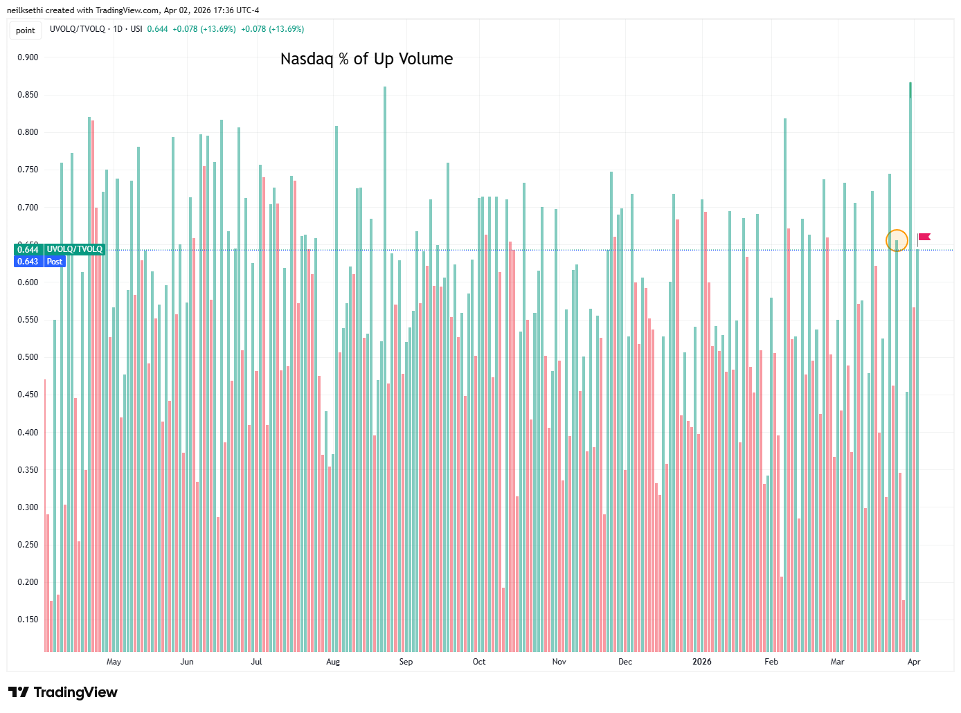 Nasdaq positive-volume ratio (intensity of buying in stocks up on the day) similarly improved to 64.3% from 56.6% despite the gain in the index falling to +0.18% from +1.16%.