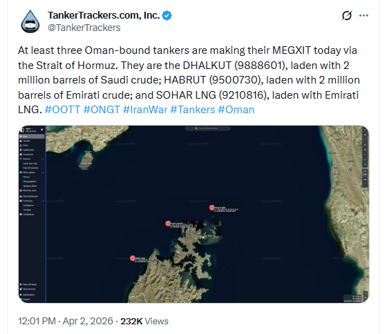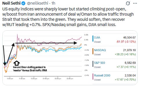 US equity indices opened trading Thursday sharply lower after President Trump’s address to the nation Wednesday night where he indicated that the Iran war would likely escalate in coming weeks as detailed in the morning update. However they would quickly find their footing and start recovering boosted by a report that Iran was drafting a protocol with Oman to permit traffic through the Strait of Hormuz in exchange for a toll (even though it is international waters). That report was followed later by a report from Tanker Trackers that some Oman flagged vessels had passed through the Strait.