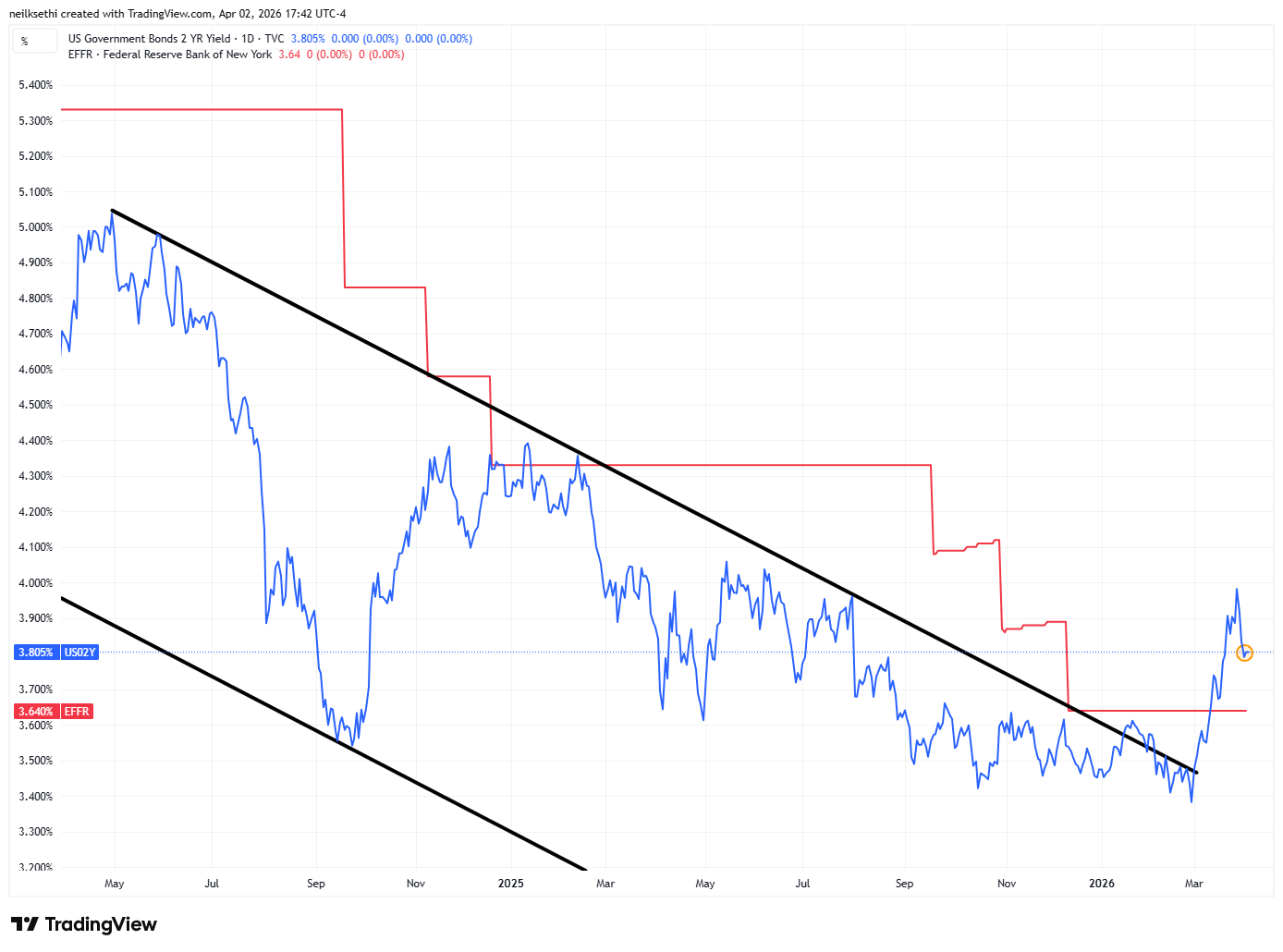I had mentioned on Mar 14th “this is now is an attractive yield unless we really aren’t going to get more than a couple more rate cuts (which is possible). I had said I don’t know that I want to buy 2-years at what is basically the 1-month yield, but now we’re above it, so I did buy some.” I had said after “I’ll probably look to add more if we revisit those levels,” and I did buy some Thursday and then again Friday. I’ll buy another slug at 4%. Seems like I might not get the chance now.