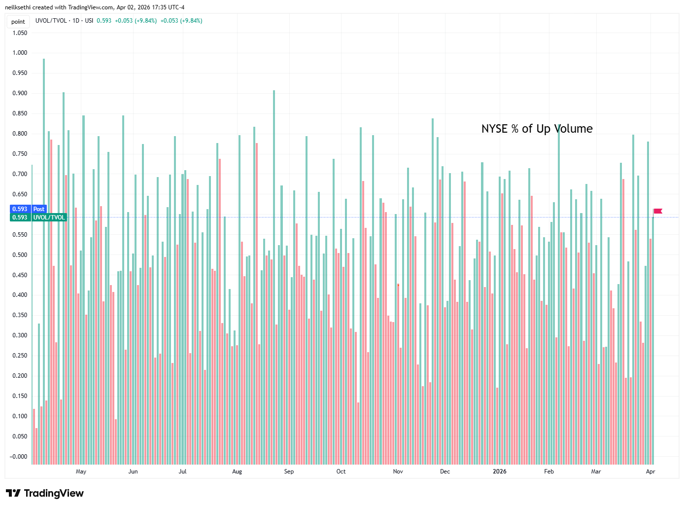 Positive issues (percent of stocks trading higher for the day), were weaker than positive volumes on both the Nasdaq at 56% (vs positive volume of 64%), and the NYSE at 59% (vs 57%).