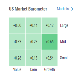 Morningstar style box saw mild gains across the box Thurs led for a third session by growth.