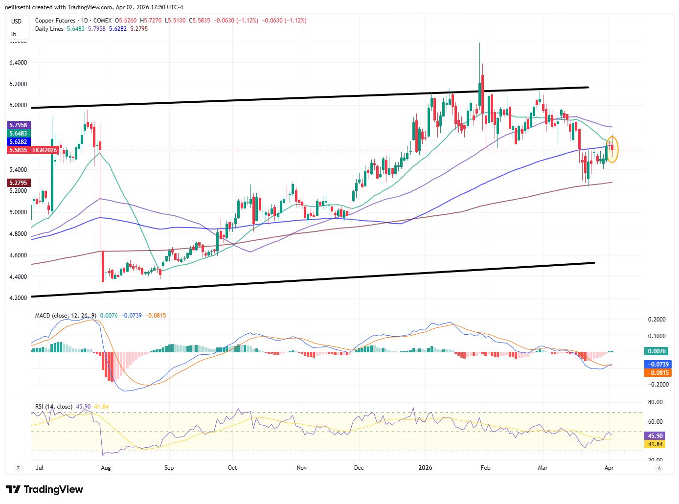 US copper futures (/HG) also fell back. As noted Thursday, the daily MACD has also flipped here to “cover shorts” positioning, but the RSI is still under 50.
