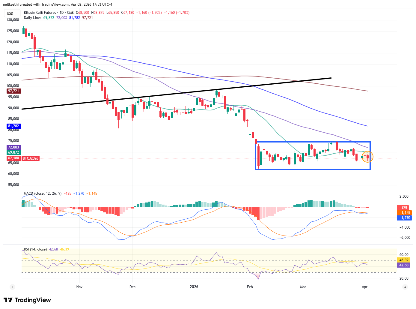 Bitcoin futures fell back remaining in their the range since the start of February (the blue box). The daily MACD as noted Friday has crossed over to a mild “go short” reading, and the RSI is under 50.