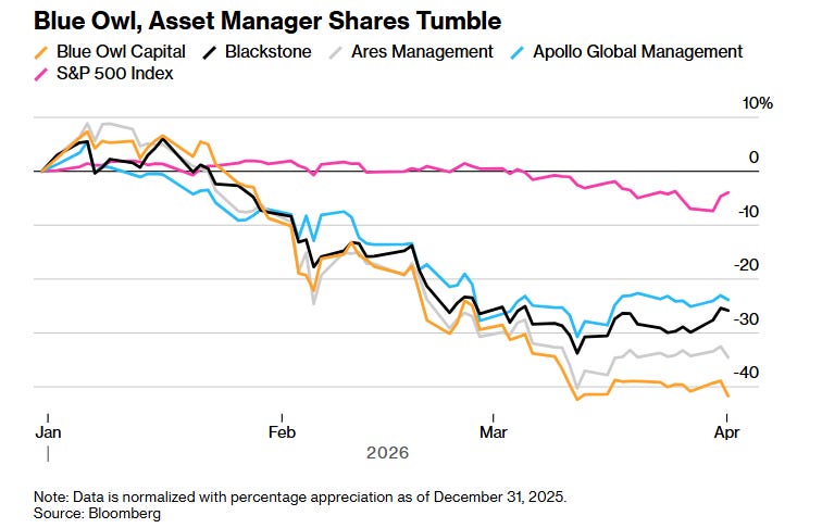 Joining Blue Owl in trading lower Thursday, the company’s peers Blackstone Inc., Apollo Global Management Inc., KKR & Co Inc., Ares Management Corp. all fell by around 3%.