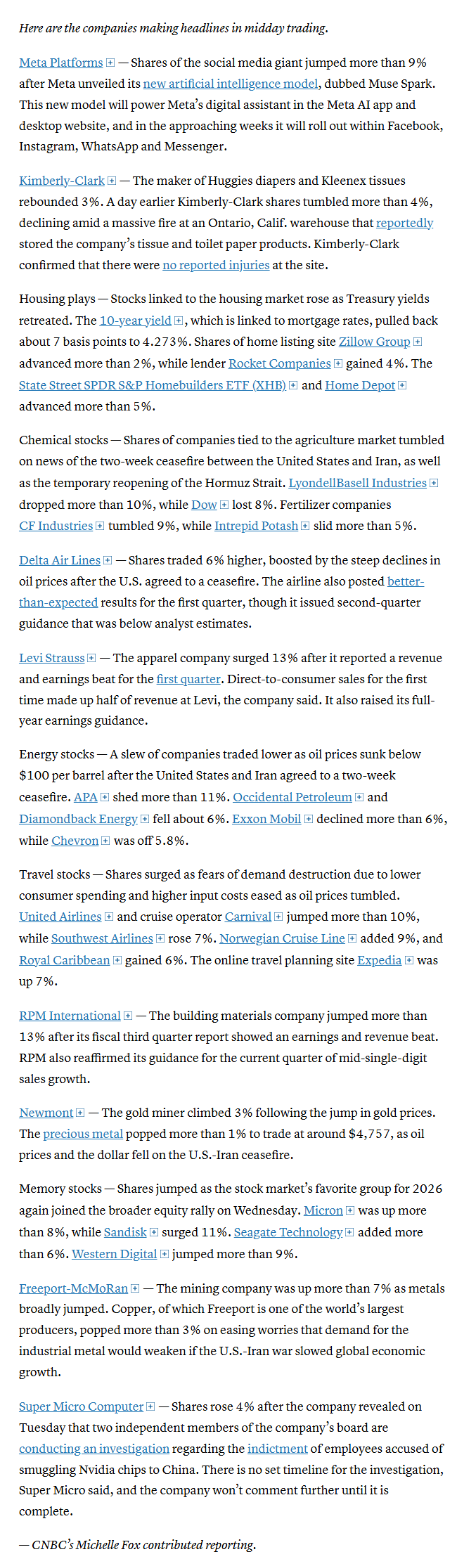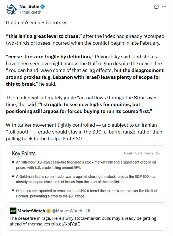““It wasn’t much of a surprise that there was an announced reprieve in the Iranian conflict. The market has gotten much better at sniffing out” Trump’s next move, said Jay Woods, chief market strategist for Freedom Capital Markets. “The concern now is if this all too familiar ‘two-week’ timeframe is going to lead to a resolution.”