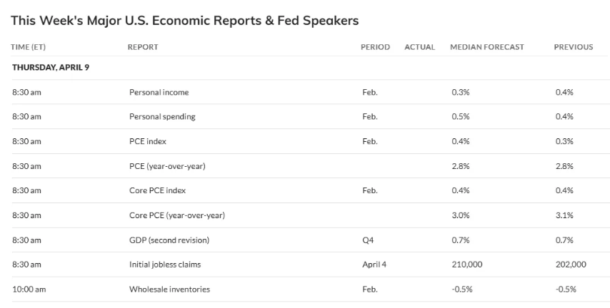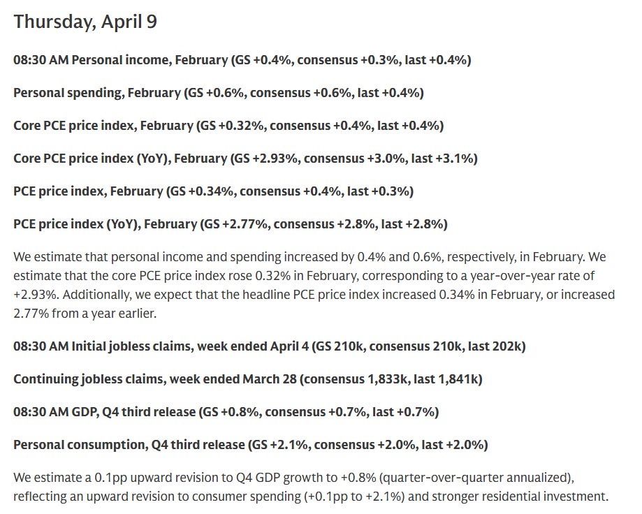 US economic data picks back up Thursday with what might be our top monthly report if it didn’t come so late in the February personal income and spending report which contains PCE prices (the Fed’s preferred inflation gauge). We’ll also get the second revision to 4Q GDP (which should come with our best look at economy-wide corporate profits), wholesale inventories, and weekly jobless claims.