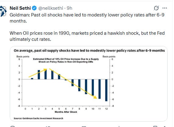 Goldman notes while oil shocks may lead to rate hikes in the near term, they often lead to rate cuts longer term: