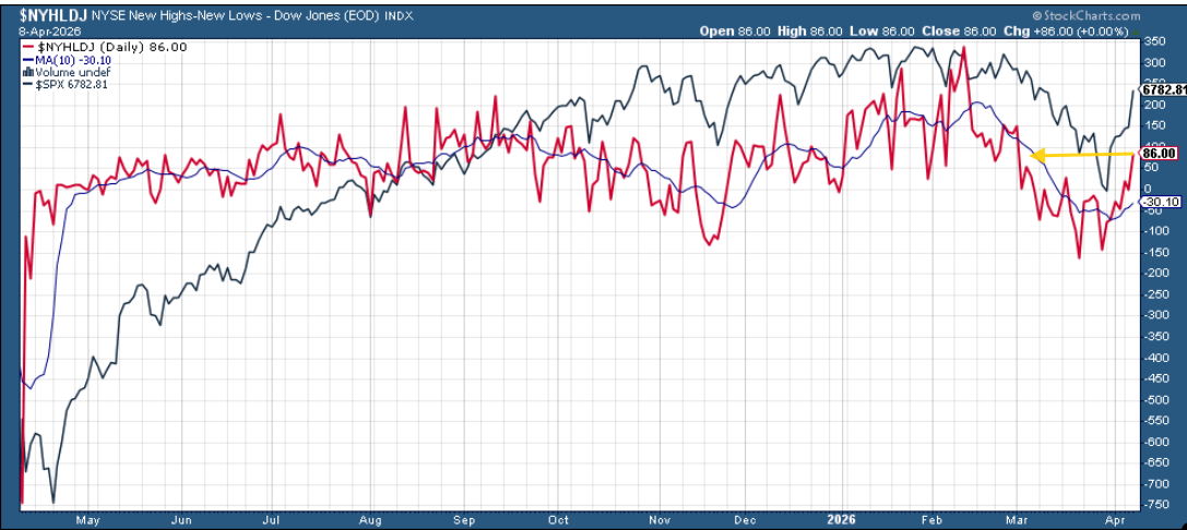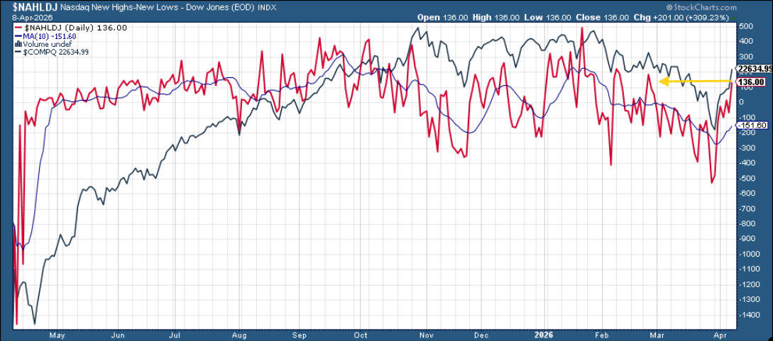 And new highs-new lows (red lines) are following index prices to the highest since February on the NYSE and Nasdaq.