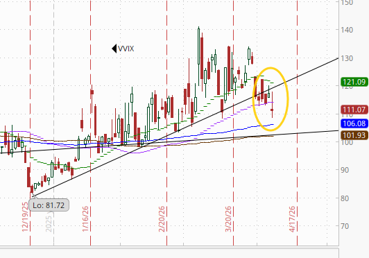 The VVIX (VIX of the VIX) at 111.1 while not at the least since February like the VIX, is under its line from the December lows, which perhaps means we might see the VIX do the same?