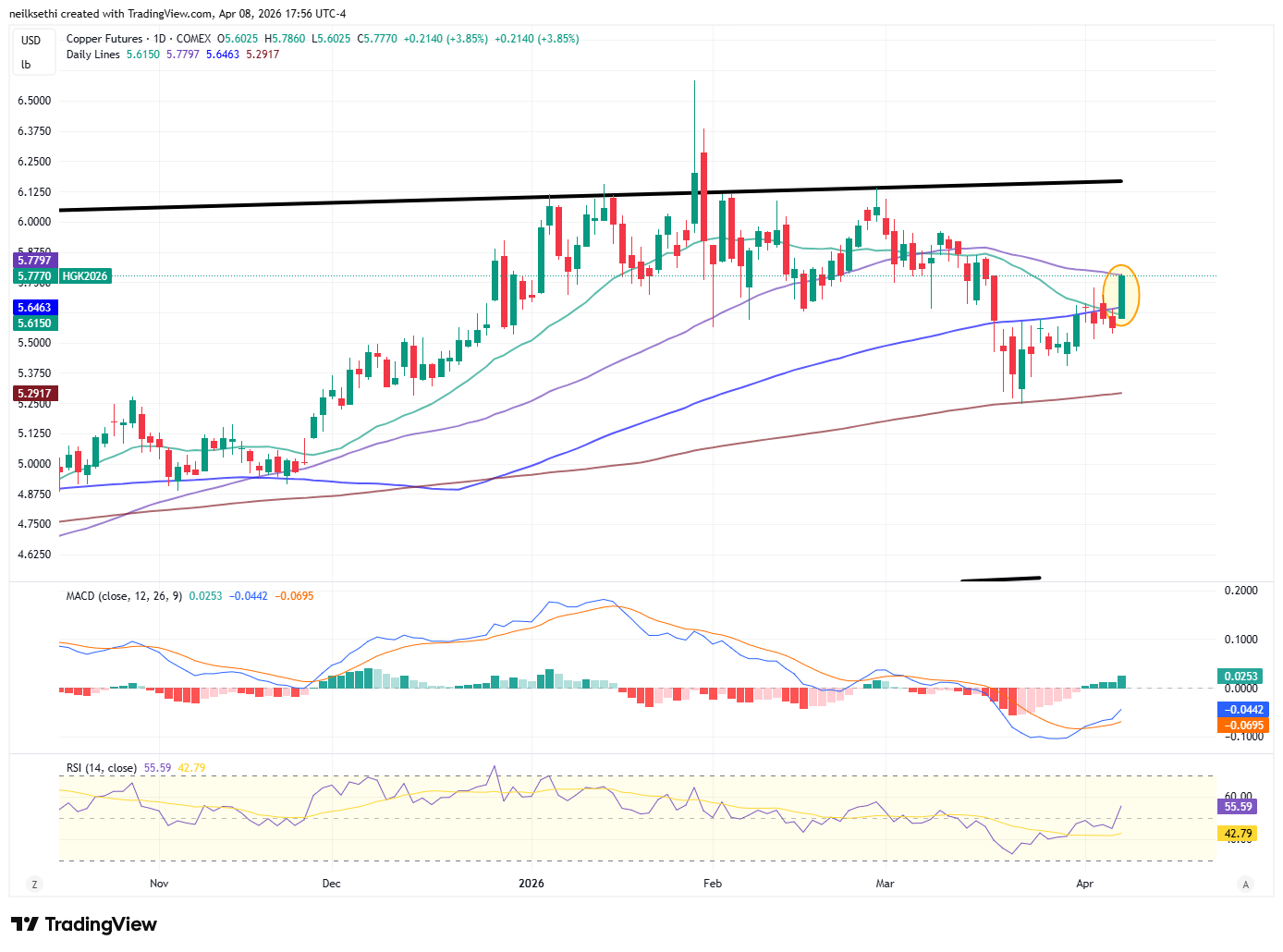 US copper futures (/HG) a stronger session than gold up nearly 4% taking them to their 50-DMA. Like gold, the daily MACD is in a “cover shorts” positioning, but the RSI is stronger.