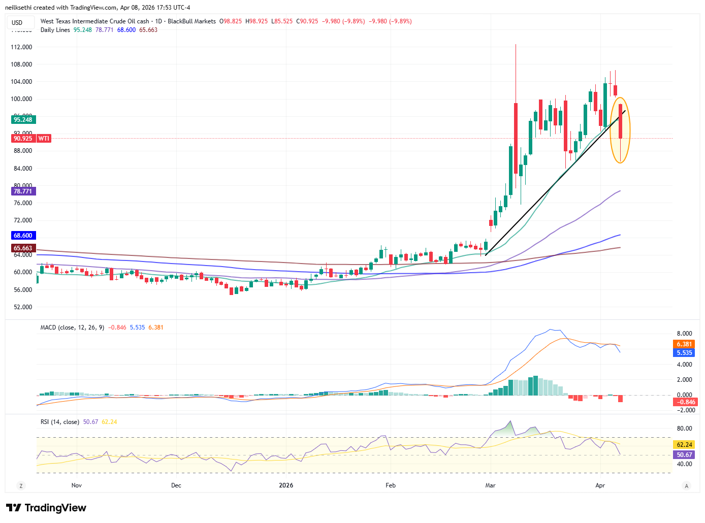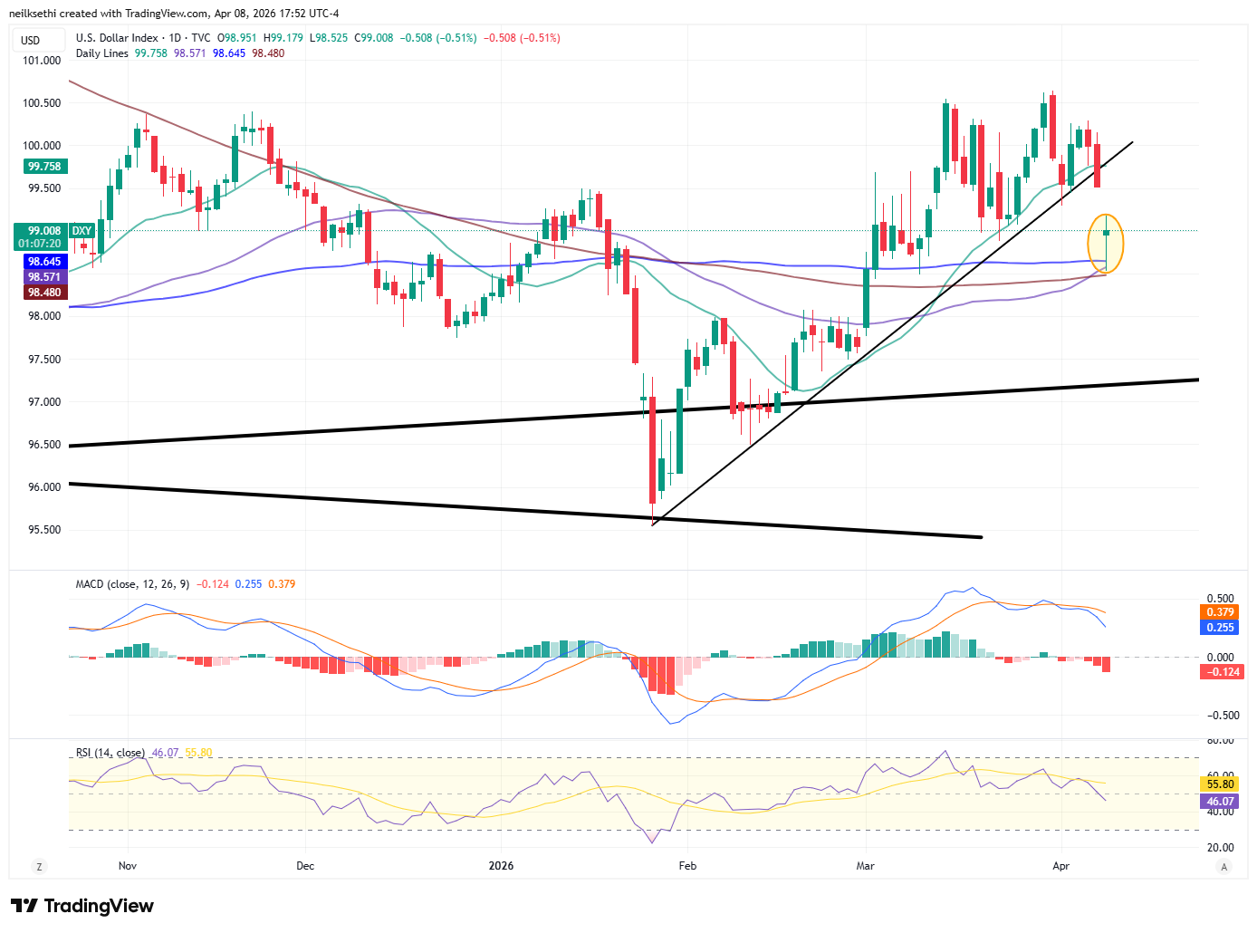WTI dropped sharply but cut some of those losses to make it back to $90. Still it’s broken its uptrend line and as noted earlier the technicals are not favorable. Its path from here likely depends mostly on whether the ceasefire holds and the Strait of Hormuz reopens.