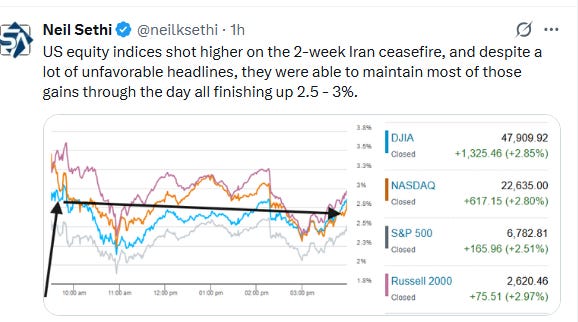 US equity indices opened trading Wednesday surging higher following the two-week ceasefire announced overnight by President Trump even as traffic through the Strait of Hormuz remained throttled by Iran and the sides seemed quite far apart on their demands for a lasting end to the hostilities as detailed in the morning post.