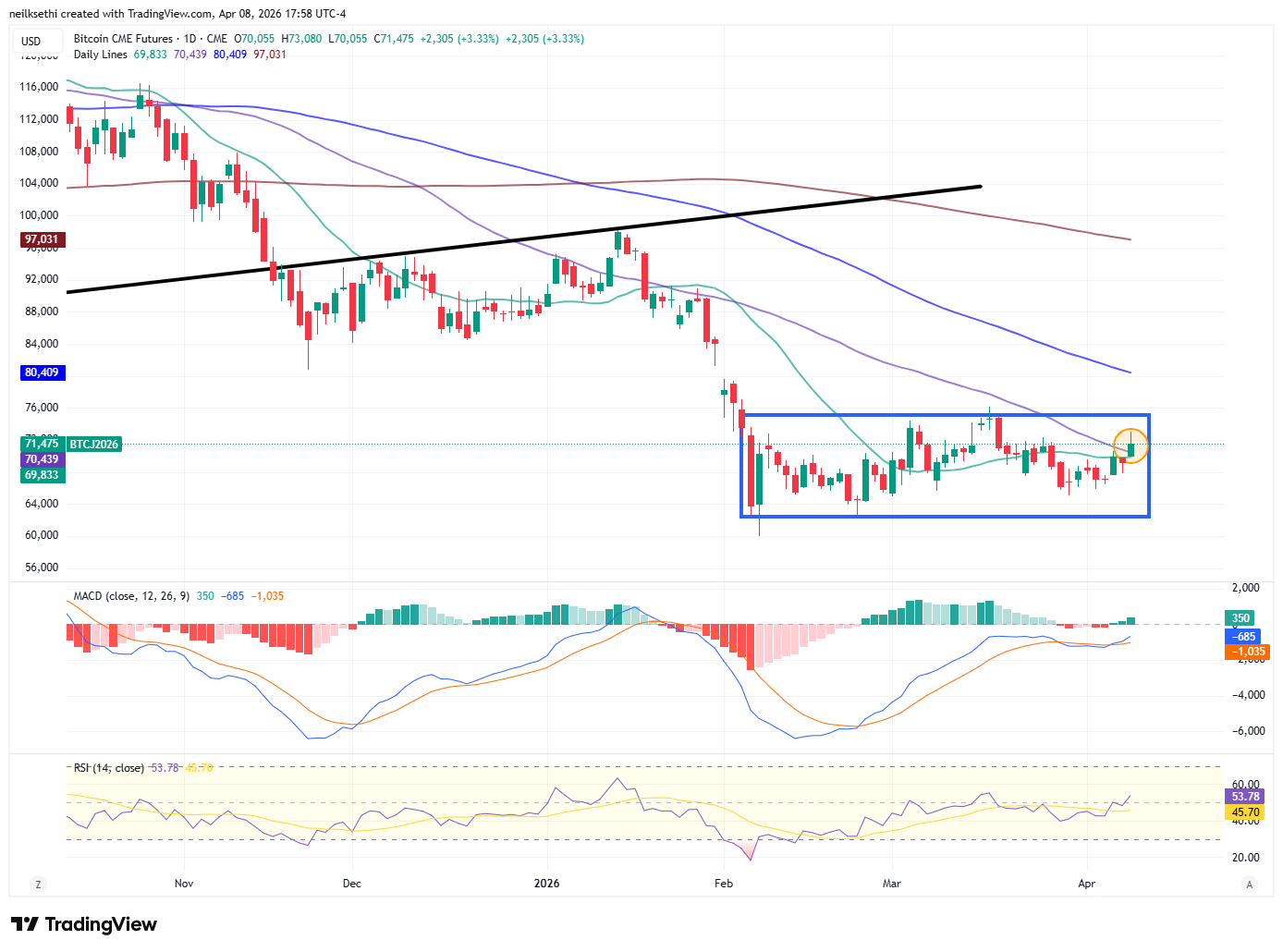 Bitcoin futures up over 3%, but for now remaining in their the range since the start of February (the blue box). The daily MACD remains in a “cover shorts” reading, and the RSI is back over 50, plus it cleared the 50-DMA so could see it test the top of the range again at least.