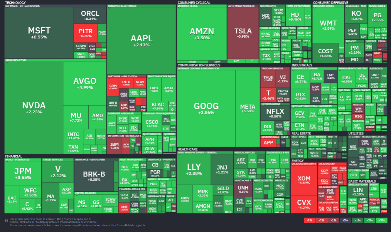 Stock-by-stock SPX flag from finviz_com consistent with bright green (>3% gains) across much of the flag. Just Energy, some software, and telecoms sat out the action for the most part.