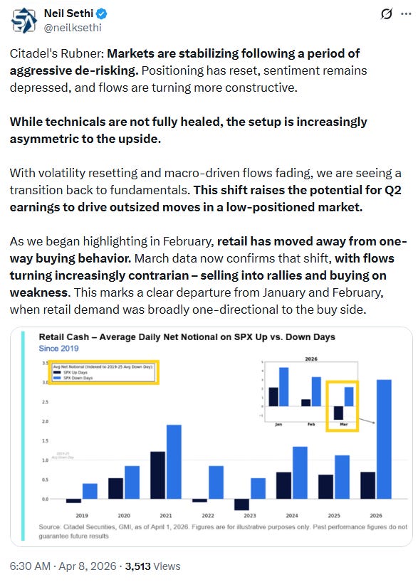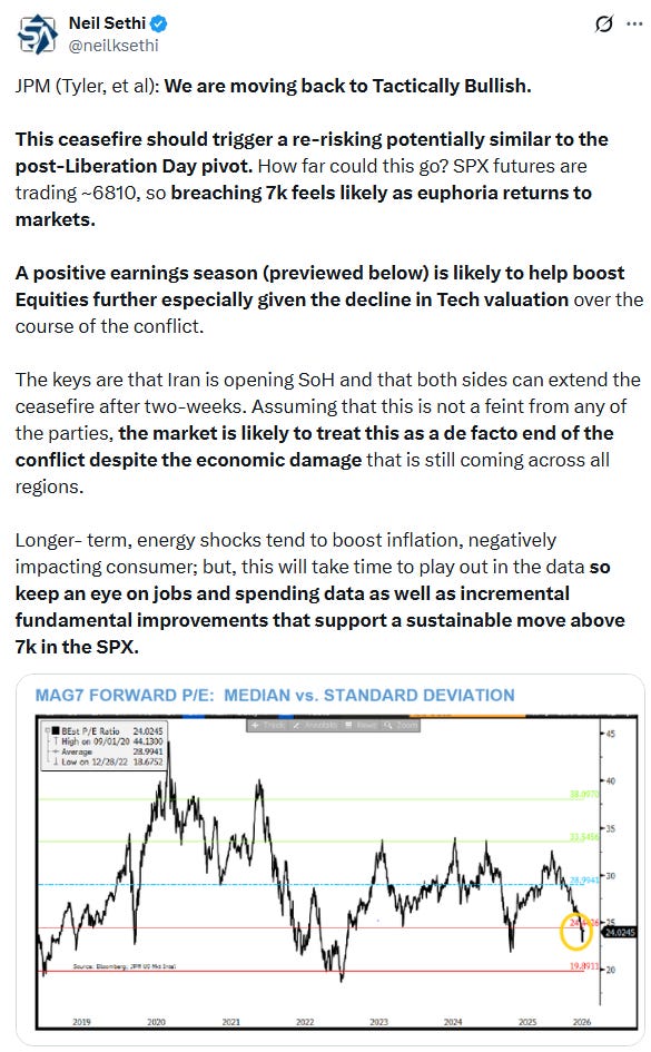 “While there are valid questions around the durability of the ceasefire and the extent of economic damage already done, Brent has retraced almost half of its Iran-driven surge, while most equities have not recovered a similar share of their losses. This gap should support continued momentum in the risk rally.”