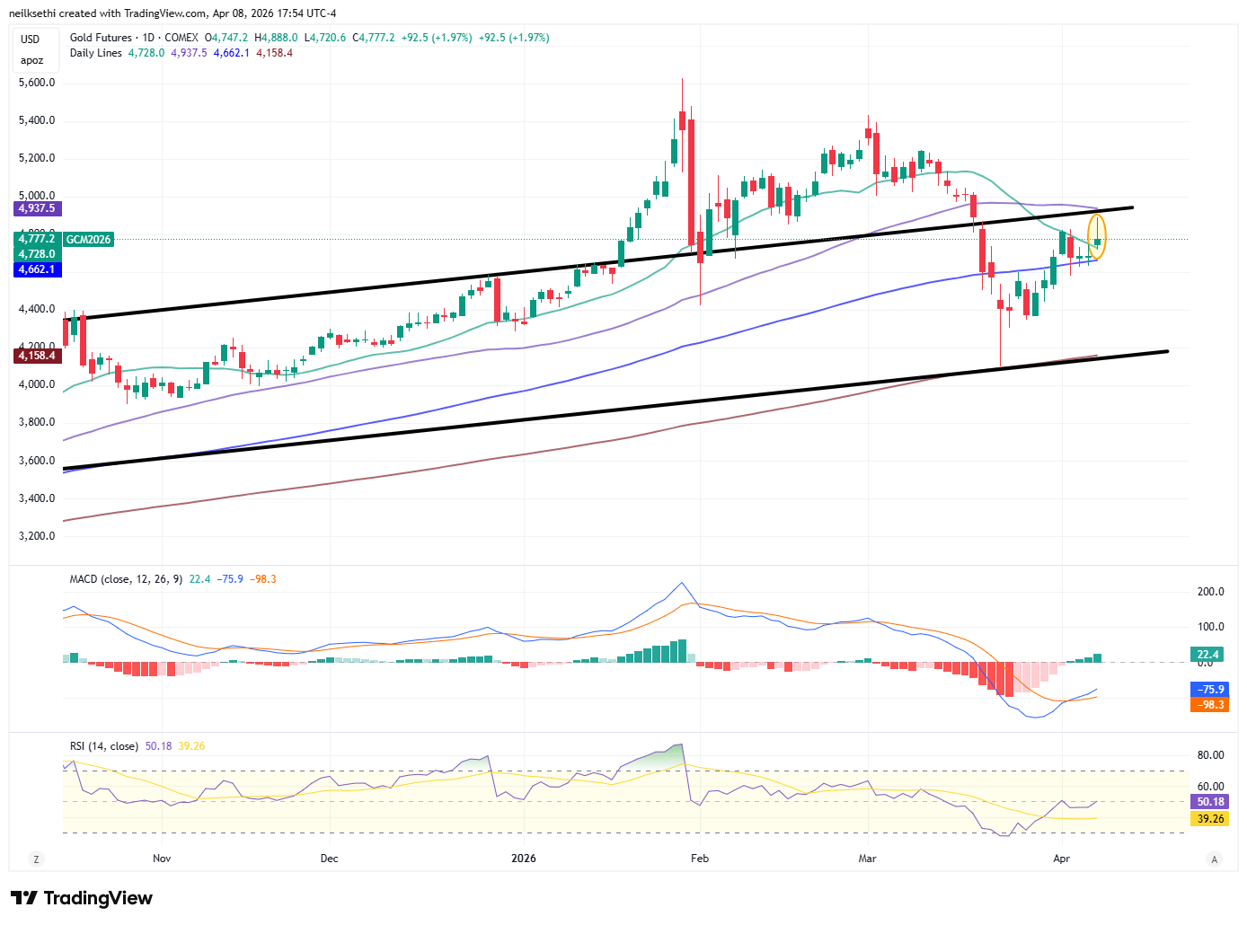 Gold futures (/GC) jumped higher but pared back much of those gains. Still finished up 2% but not even a 1-week high. They remain in their old channel from early 2024 that they left at the start of 2026 for a couple of months. The technicals are mixed with the MACD in a mild “cover shorts” reading while the RSI is around 50 but it seems to ironically have liked the dialing back of the geopolitical tensions.