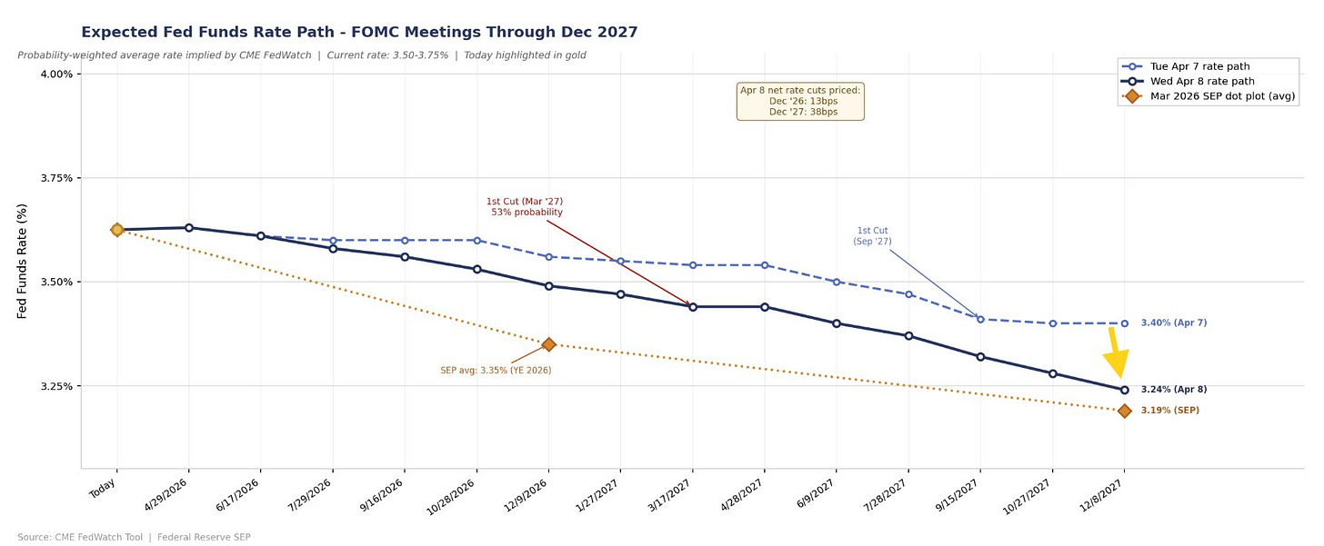 Pricing for 2026 now has +14bps of cuts (up to half of the average dot on the dot plot of +28bps in cuts). 2027 is at +39bps of cuts from current levels (now just a little below the +43bps of cuts from current levels for the average dot on the dot plot), corresponding to a terminal rate of 3.24%, down from 3.45% Monday, but also up from 2.80% pre-war.
