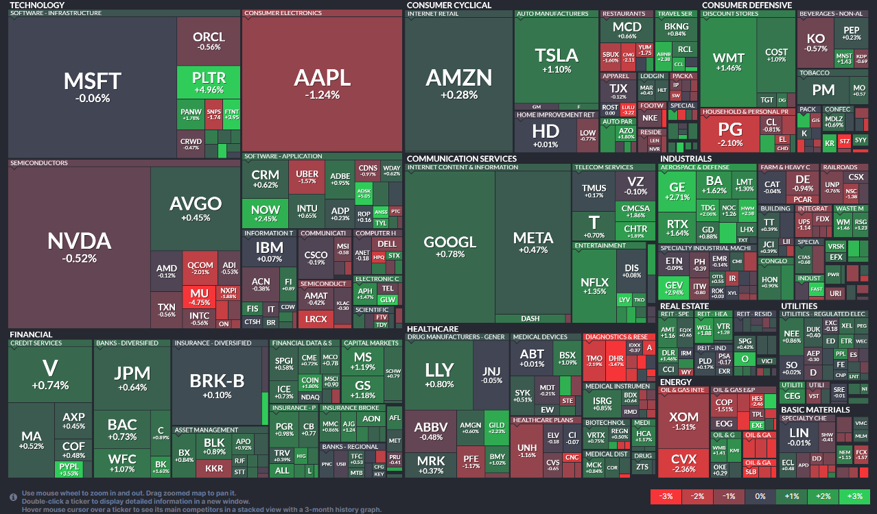 SPX stock-by-stock flag from FINVIZ_com relatively consistent with a lot more green today than Friday with a much better performance from financials, software, and telecom which were weak on Friday. Industrials were particularly strong today. Tech hardware, energy, and medical devices (again) were weak.