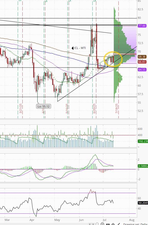 #WTI futures fell back once again to the uptrend line from the May lows as they continue to struggle with the 200-DMA resistance. The daily MACD remains in “sell longs” positioning but is close to turning more positive while the RSI is just over 50.