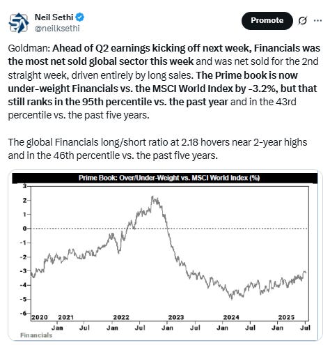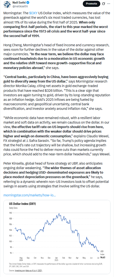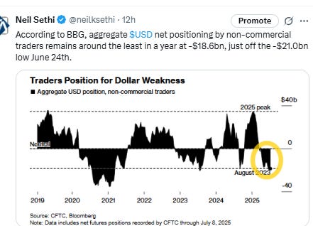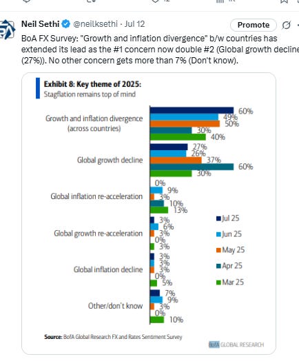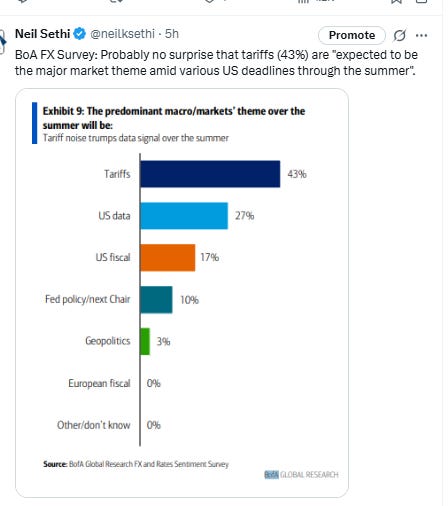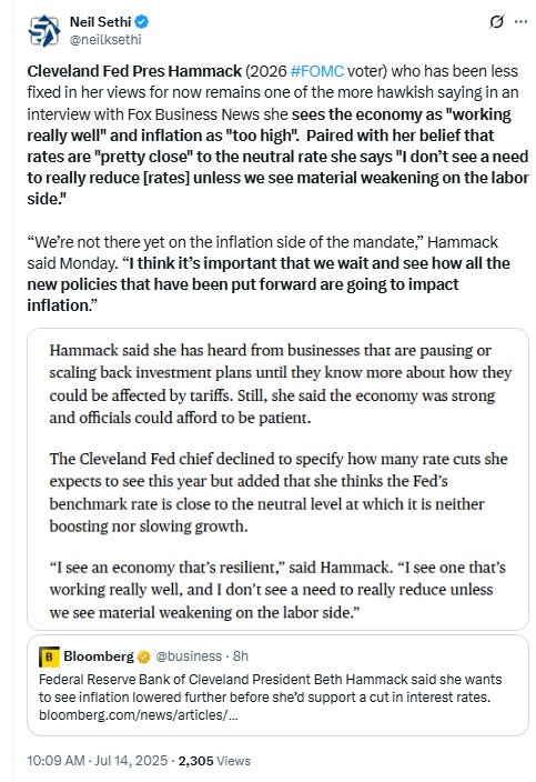Fed rate cut bets shifted into 2026 following a hawkish interview by Cleveland Fed Pres Hammack with pricing for 2025 #FOMC rate cuts -3bps to 48bps according to CME’s #Fedwatch tool, (down from 64bps pre-June NFP & 92bps on May 1st (and the peak this year at 103bps on Apr 8th) (the low was 36bps Feb 11th)).