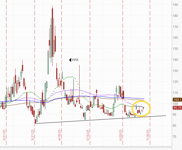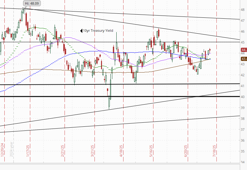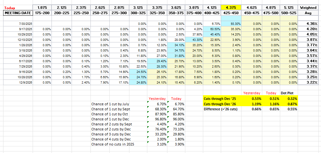 I had said when it was around 4.35% (in Jan & again early Feb) that I found the 2-yr trading rich as it was reflecting as much or more chance of rate hikes as cuts while I thought it was too early to take rate cuts off the table (and too early to put hikes in the next two years on), but then the 2yr fell to 3.65% past where I thought we’d see it, so I took some exposure off there. We got back there but I never added back what I sold, so I stuck tight. Ian Lygan of BMO saw it going to 3.5% by year’s end before all this tariff business but now thinks it’s at fair value at around 3.75% so I took some more off at the end of June.