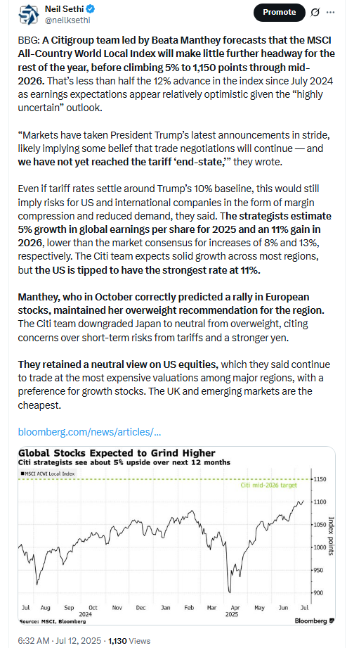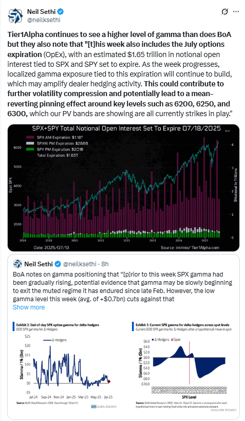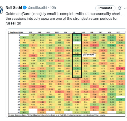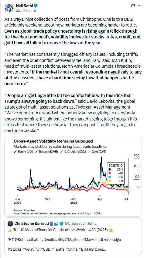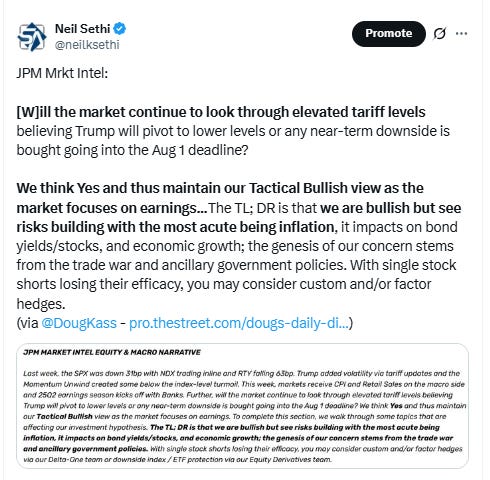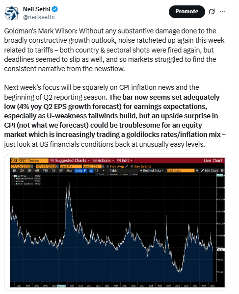 “I don’t think people are viewing any of the data points expected over this week as being materially indicative of how to position portfolios,” said Josh Rubin at Thornburg Investment Management. “We’re still in a waiting game around tariff policies as well as additional inflation and employment data that could influence Fed decision-making, and broader geopolitical developments, which are also in a quiet period.” Rubin notes that activity naturally slows down during the summer period, and while investors will pay attention to earnings, most won’t view them as highly indicative of companies’ future outlooks, rather waiting to hear about any updated thoughts on tariff policy.