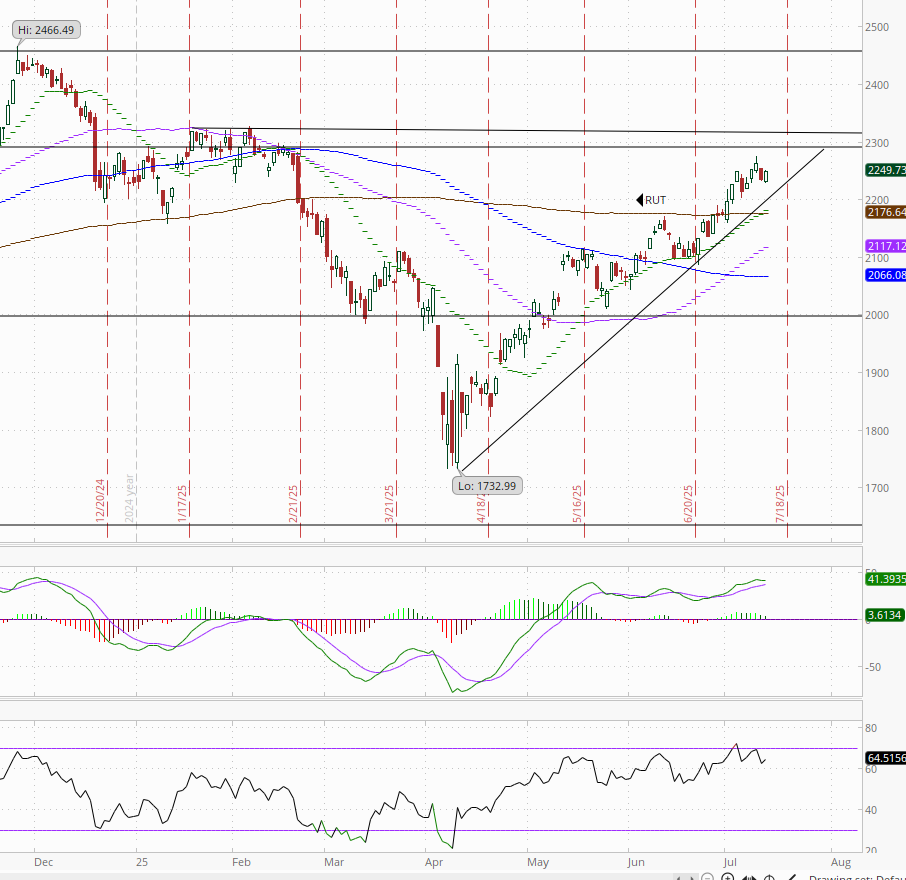 The SPX closed just under its ATH as it continues to trade mostly sideways over the past seven sessions. Its daily MACD remains positive although very mildly so now, and the RSI continues to fluctuate around 70.