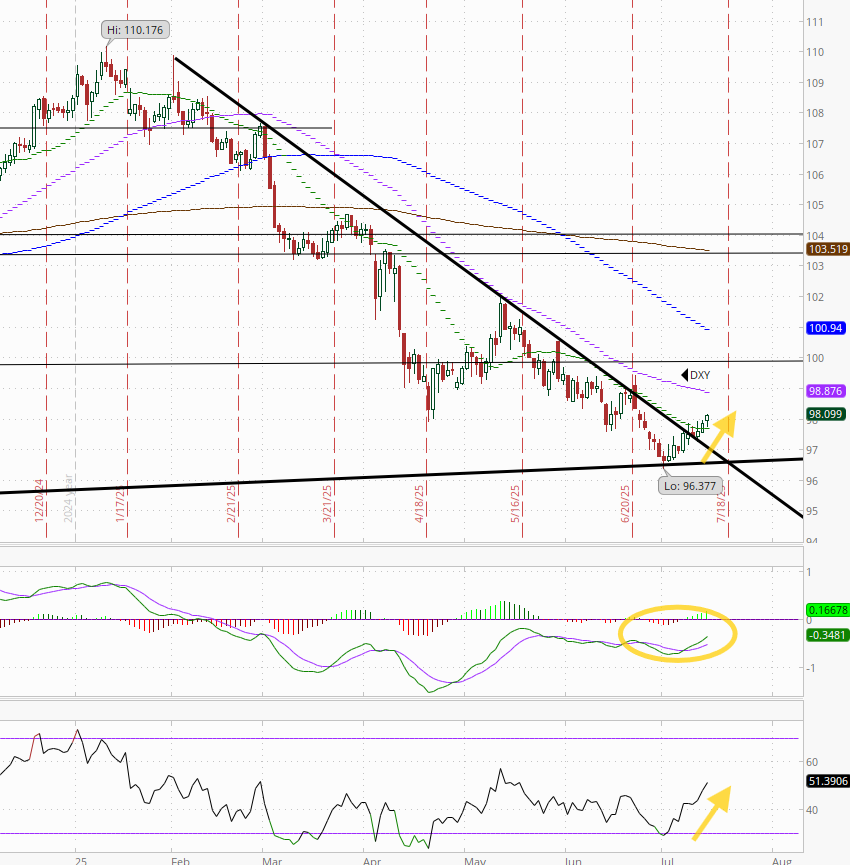 The daily MACD as noted last Monday crossed over to “cover shorts” while the RSI is now the highest in nearly two months and over 50 after having moved from under to over 30, which can be a signal of a reversal of a downtrend, so it’s got a lot of boxes checked for a move higher.