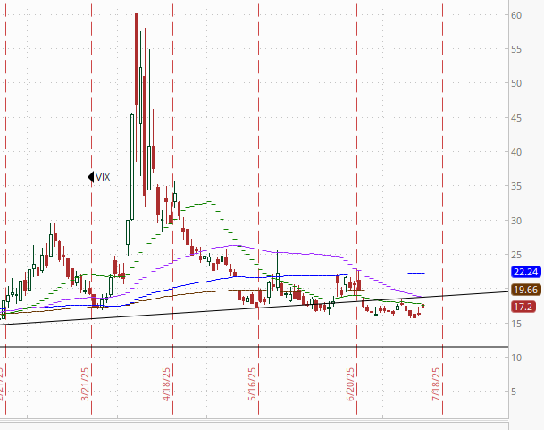 VIX edged up to 17.2, after closing sub-16 Wed & Thurs for the first time since Feb 20th, overall remaining in the same narrow range it’s been in for almost three weeks. The current level is consistent w/~1.08% average daily moves in the SPX over the next 30 days. Remember, though, we’re in a seasonally strong period for the VIX.
