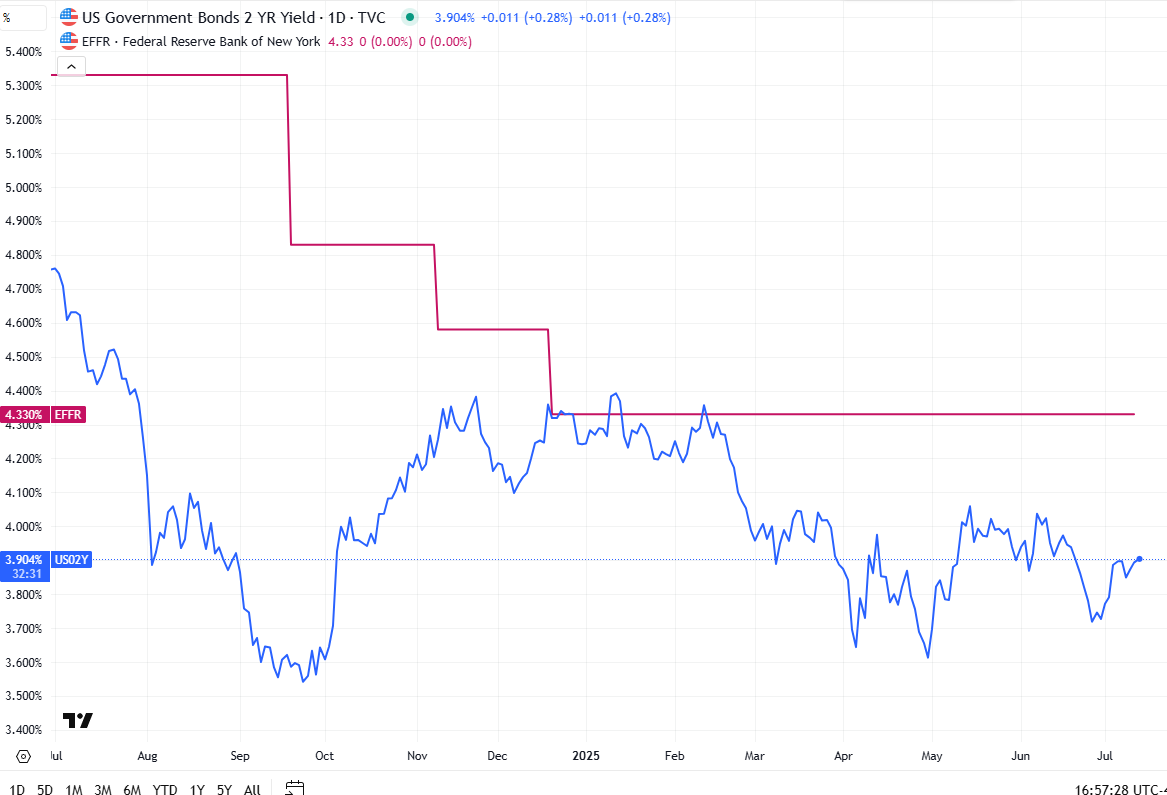 The 2yr yield, more sensitive to #FOMC policy, +1bps to 3.90%. It is -43bps below the Fed Funds midpoint, so still calling for rate cuts but also up +18bps this month.