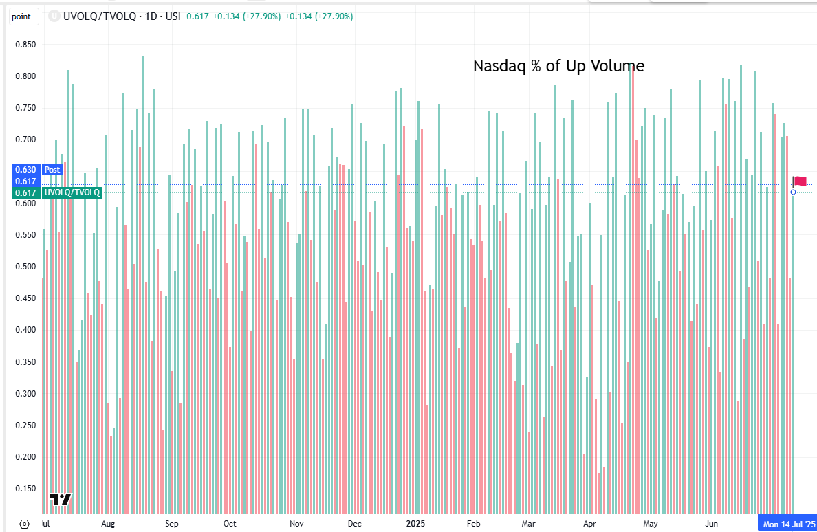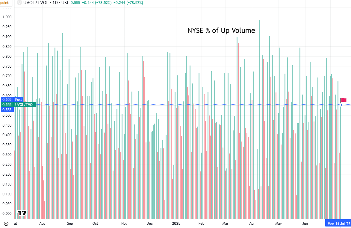 That might also explain why the performance today was a bit lackluster compared to some days last week. For example, Thursday we saw 76.1% positive volume on just a +0.09% advance in the index.