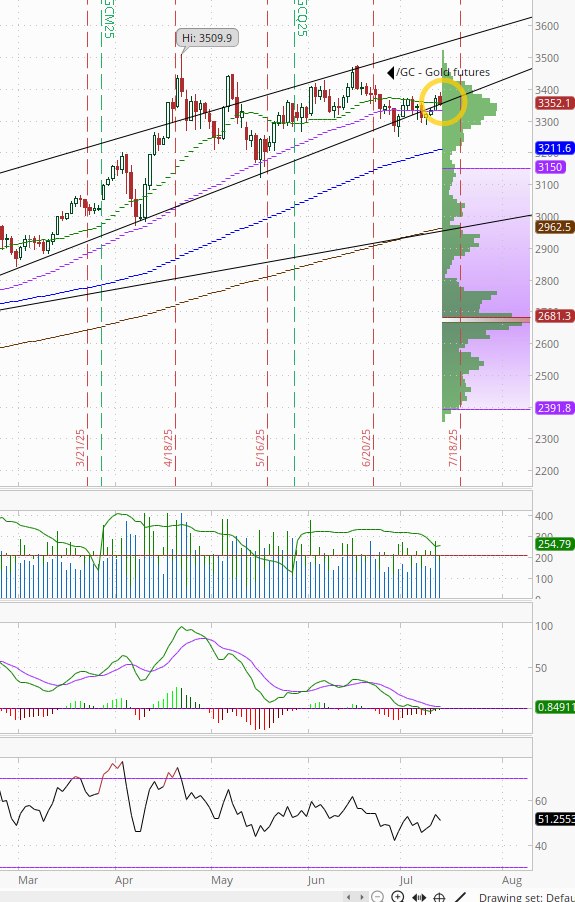Gold futures (/GC) edged back a half percent from a 3-week high. They remain around the bottom of the uptrend channel from January just above the 50-DMA. Daily MACD remains negative as noted two weeks ago but is very close to flipping positive, while the RSI remains just over 50.