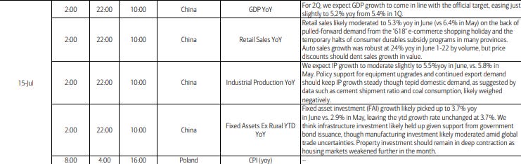 In EM, we’ll get the China monthly “data dump” including retail sales, industrial production, fixed asset investment, property sales, and employment along with GDP among other reports including South Korea and India trade and Poland CPI.