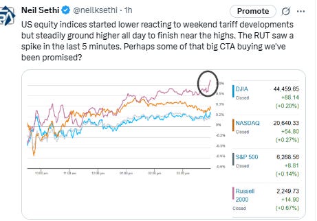 Major US equity indices started the day again modestly lower after President Trump announced increased tariffs on EU and Mexico, Trump administration officials increased pressure on FOMC Chair Powell, and ahead of a busy week of earnings and economic data. They steadily ground higher all day though to finish near the highs with modest gains. The RUT saw a spike in the last 5 minutes. Perhaps some of that big CTA buying we've been promised?