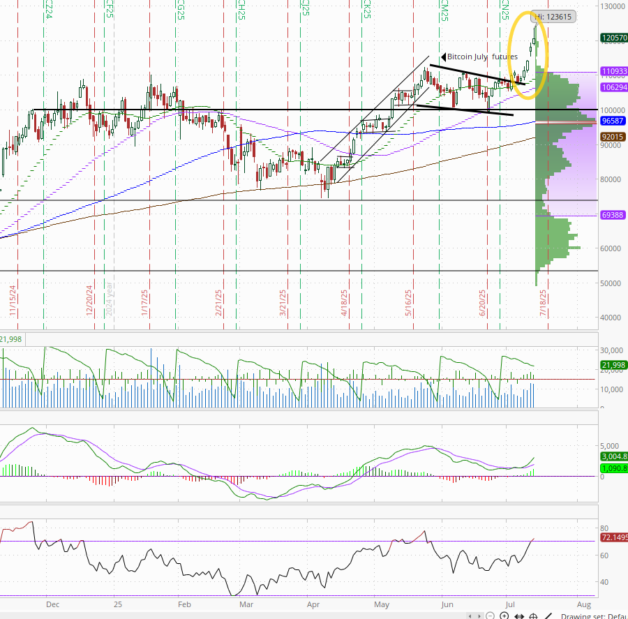 Bitcoin futures up another +2% taking their four-day gain to +10%, although they finished well off the highs. Another daily ATH close, now firmly out of the congestion zone they had been in the past two months. The daily MACD and RSI are positive, and the latter is just starting to get overbought.