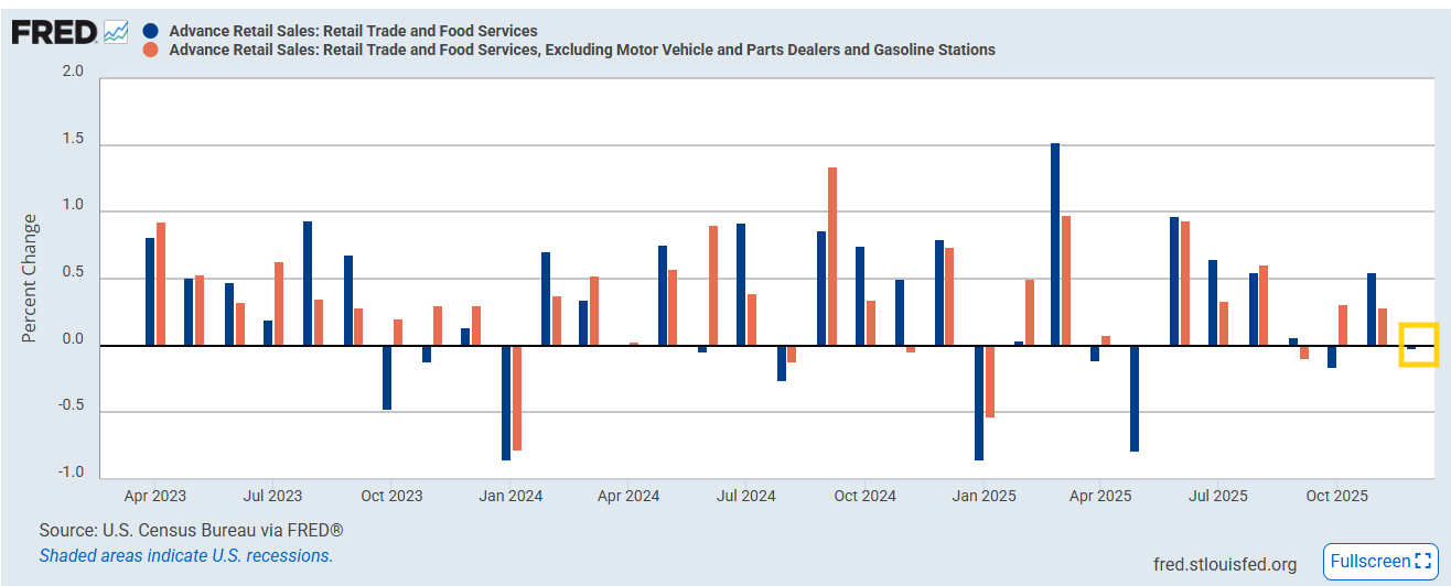 The key control group sales (which feed into GDP as the goods consumption component) came in at -0.10% vs +0.40% expected, and after Nov was revised down to +0.16% from +0.40%. That should overall see a healthy cut to 4Q GDP estimates.