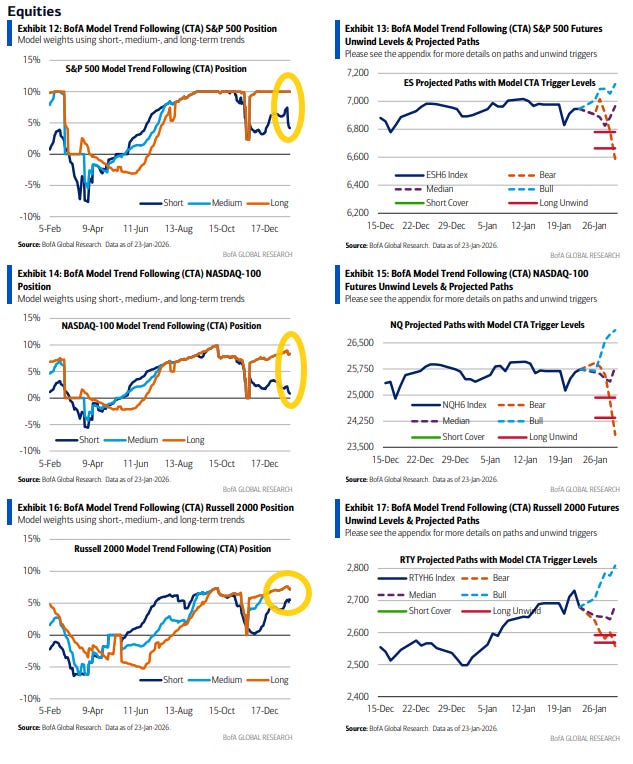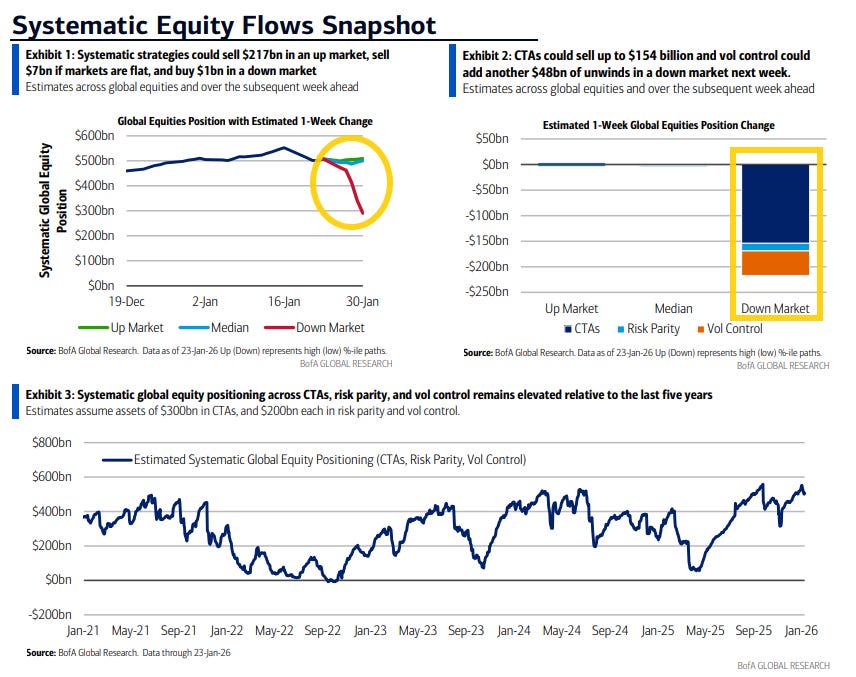 Incredibly comprehenisve roundup as always. The breakdown of systematic positioning across CTAs, vol control, and risk parity is particuarly useful for understanding potential selling pressure. I'm curious how you weigh conflicting signals from different data sources like BoA vs DB models? As someone who tracks market flows, these weekly updates are an invaluable resource for contextualizing the noise.