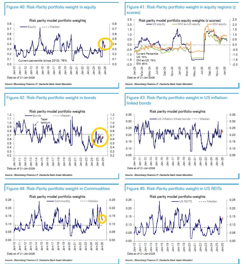 DB models risk parity funds (est ~$250bn in max AUM) much differently than BoA with the equity allocation at the 76th %ile and commodities the 75th but bonds at just the 41st (although the charts don’t look quite in line with that):