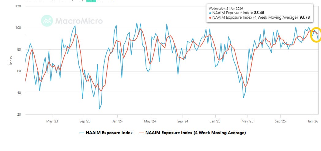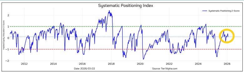 Holding things back at the big-cap index level has been the weakness in the heavyweights (Mag-7 is flat not only for the year but since Sept 22nd) along with selling from systematic strategies last week with the increased volatility. But nevertheless, the index remains in its upwards channel since June, supported by previous Fed rate cuts (and a very high bar for hikes), solid if not spectacular earnings (even if they’re not being rewarded as they historically have for a third consecutive quarter), a solid economy that is showing tentative signs of reaccelerating (see Economy section), a continued strong retail bid with hedge funds also now participating, systematic strategies that have maintained high levels of exposure even if trimming at the margins, and buybacks reaccelerating to record levels (even if just average on a % of market cap basis). Seasonality is also favorable in January and sentiment while positive is not frothy (the “sweet spot”), while valuations, while high, are off their most extreme levels.