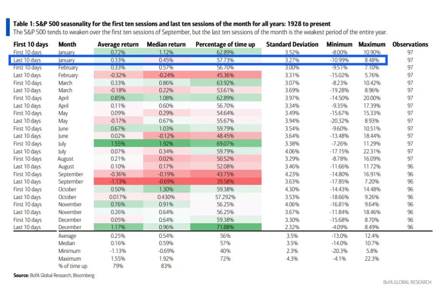 The second half of Jan has also been positive 57.7% of the time, a touch above the 56% average and in-line with the 57% median for all halves, while the standard deviation (volatility of returns) is 3.27%, down from 3.52% for the first half and below the all-halves avg/median of 3.5%.