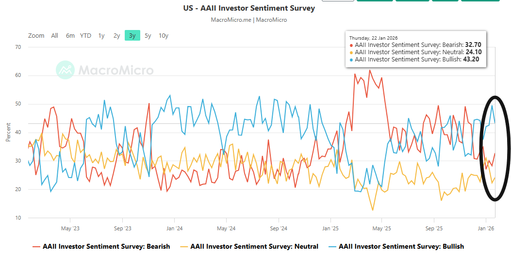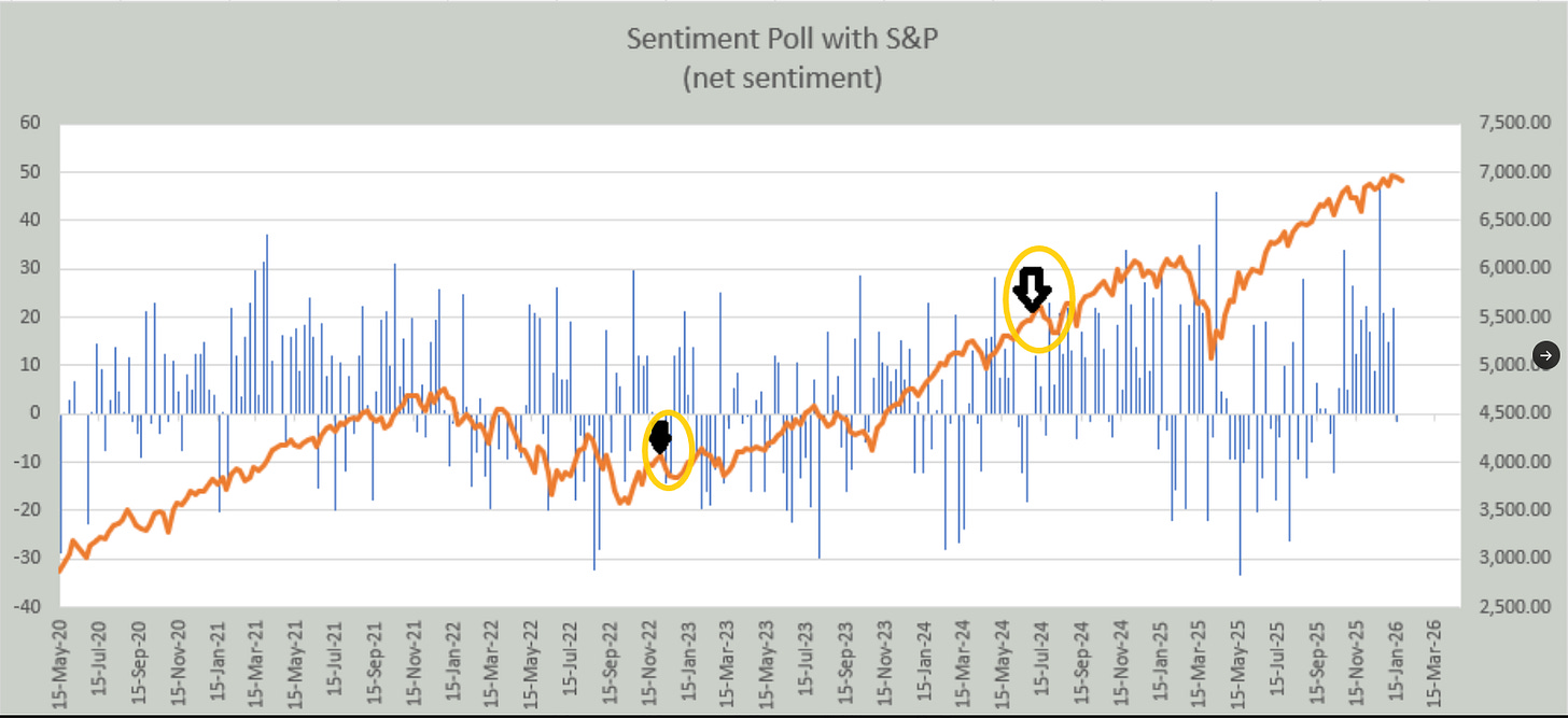The Neutral camp (yellow line) edged up to 24.1% from 22.3%, the least since Nov 13th and remaining under the long-run average of 31.5% for the 78th week in 80 (since July ‘24).