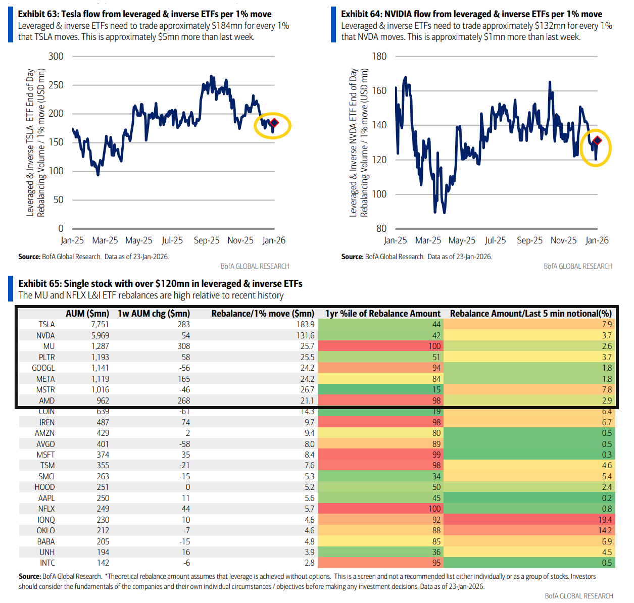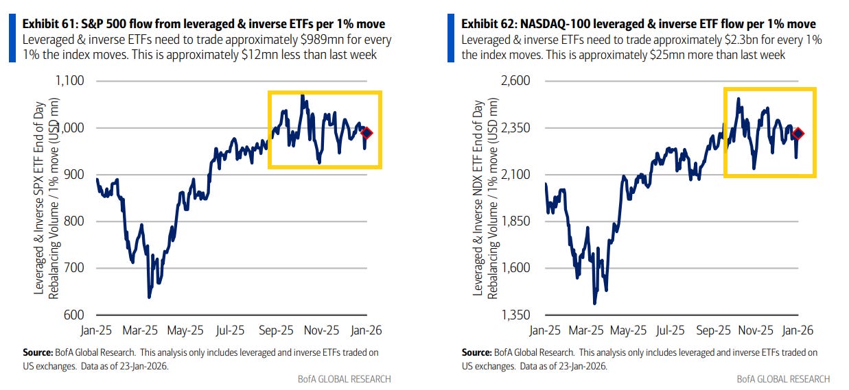 I like to look at the impact of moves in leveraged ETFs on the overall market as a barometer of risk appetite (the greater the impact, the more investors have in these ETFs which I think of as “higher risk”), and both SPX and NDX leveraged ETF AUMs were little changed remaining in their recent ranges and overall much closer to the highs of 2025 than the lows.