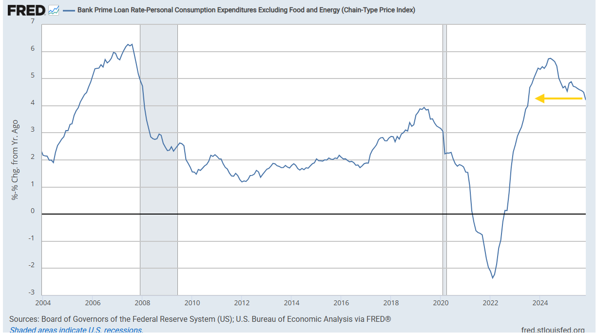 Starting to get a little relief for small businesses or HELOC borrowers as the real prime rate (inflation adjusted using core PCE) fell back to 4.20%, the least since July ‘23.